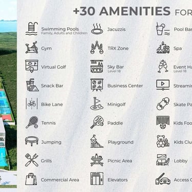 Más de 30 amenidades: albercas y jacuzzis, pool bar, gimnasio y spa, boliche, tenis, pádel, área de picnic, sky bar, golf virtual, skate park y ciclovía.